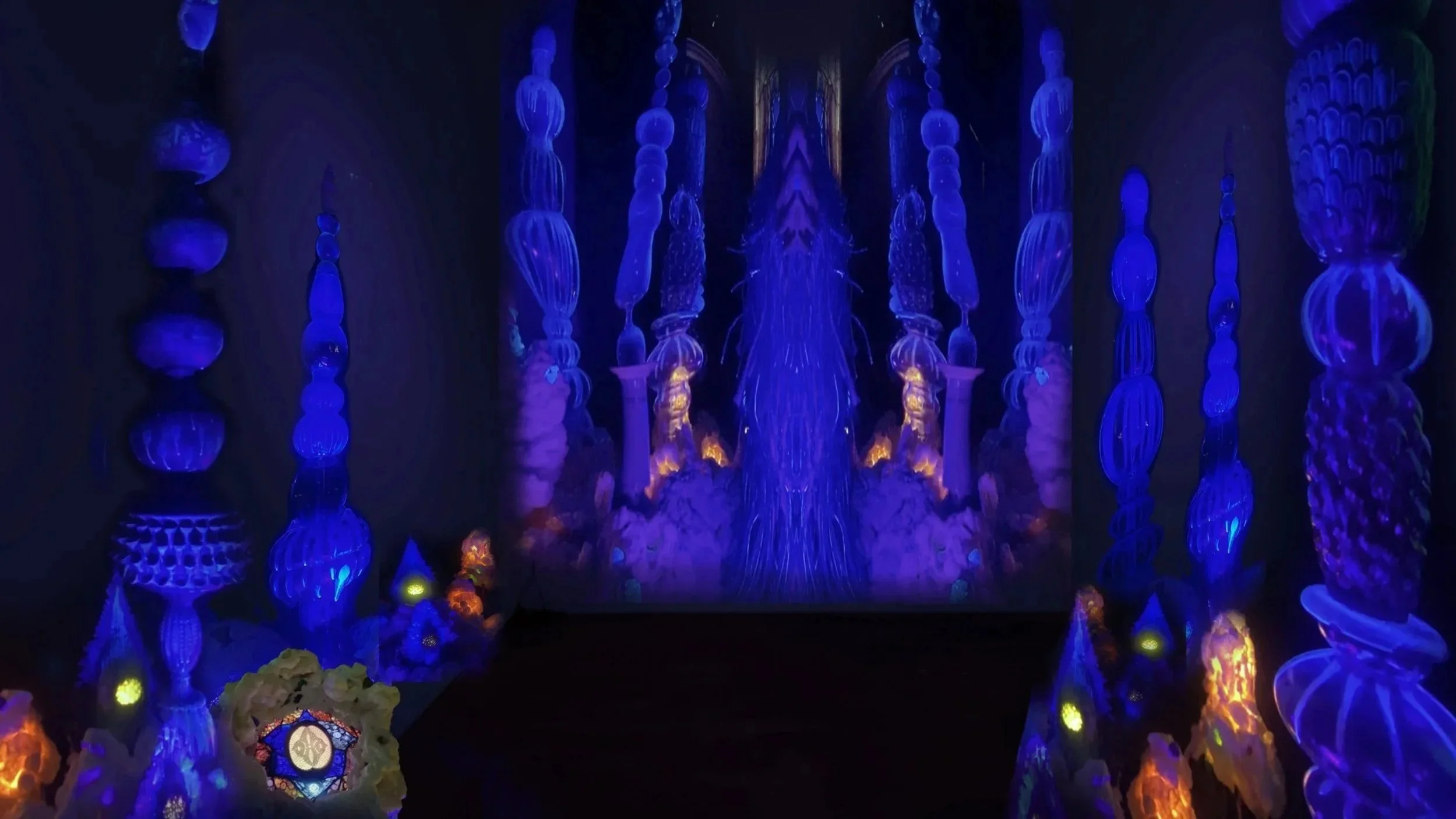 The installation combines moving image with glowing stained glass lights and sculptural totems in ceramic and glass, transforming the space into a site of play and prophecy. The oracle suggests that resilience lies not in certainty but in embracing the unpredictable forces that shape our lives.