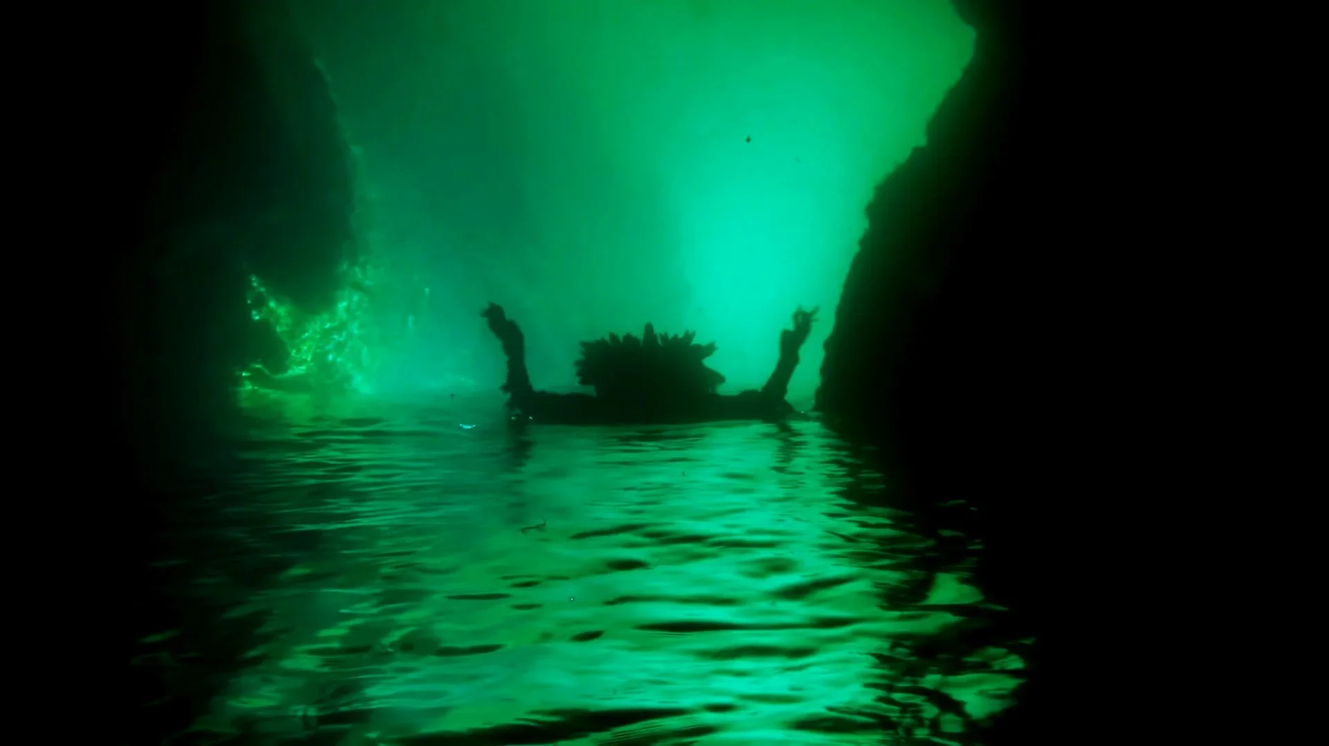 The Secret Cave (HD video, 8m48s, 2022) is a film by Rayleen Clancy inspired by Percy Bysshe Shelley’s poem The Witch of Atlas. Filmed on location along the Irish coast, it transforms the discovery of a hidden littoral cave into a portal for myth, metamorphosis and visionary experience. Combining performance, mirrored imagery and layered sound, the work evokes an otherworldly realm where archetypes emerge from sea, rock and light.
